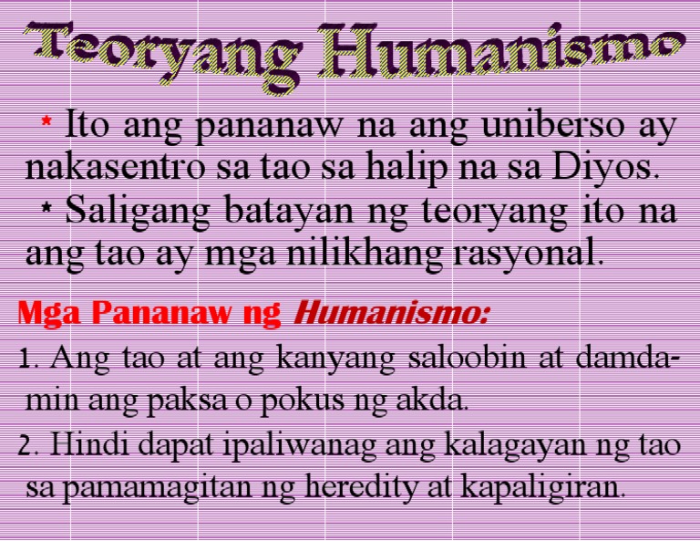 Teoryang humanismo halimbawa ng kwento Teoryang Humanismo Paalam sa Pagkabata ni Santiago Pepito na isinalin sa Filipino ni Nazareno D. Ang Humanismo ay sumibol sa panahon ng Muling Pagsibol o Renacimiento Renaissance Ito ay nagmula sa salitang ingles na Human o tao sa Filipino. Im laid back and get along with everyone.