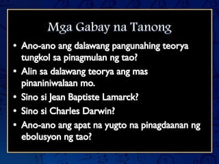 Ano ano ang dalawang pangunahing teorya tungkol sa pinagmulan ng tao. Halimbawa ng teorya sa ganitong diwa ang teorya ng relatibidad ni Albert Einstein. Ito ang ating tahanan. Ayon sa sinaunang alamat ng mga Pilipino nilikha ni Bathala sina Malakas at si Maganda na nagmula sa isang malaking kawyan.