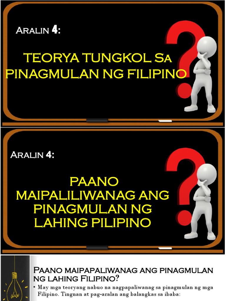 Magkakaroon tayo ng bagong kaalaman sa pinagmulan ng sinaunang Pilipino at malinang ito sa ating kaalamanan sa ating kasaysayan. Ang Pinagmulan ng lahing Pilipino Mga Ibat - ibang Teorya ng Pinag mulan ng Lahing Pilipino Layunin Upang malaman natin ang ibat ibang teorya ng pinagmulan ng mga sinaunang Pilipino ayon sa mga dalubhasa. Be notified when an answer is posted.