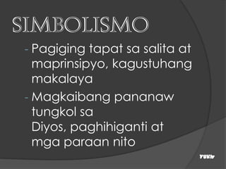 Realismo - Ang mga naranasan ng mga Pilipino sa ilalim ng Espanya ay maaaring makita pa rin sa totoong buhay tulad ng diskriminasyon at pagpapahirap ng mga Espanyol sa mga Pilipinas. Sa pagdaraos ay naihatid nila sa isat isa at marahil ay sa mga taong nakabalita na rin. ARAL Masayang hinaharap ng taong may positibong pananaw ang bawat pagsubok na dumarating sa kanyang buhay.