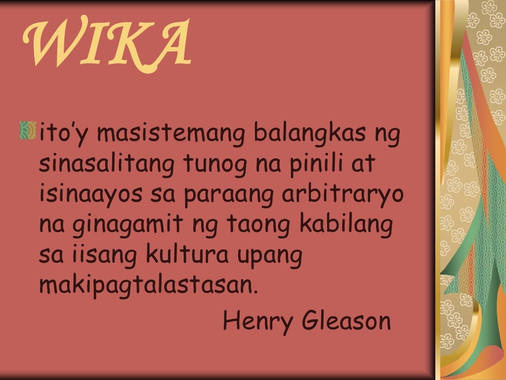 Wika - katuturan kahalagahan katangian antas at teorya Wika G. Teorya ng Pinagmulan ng Wika. Binigyang kahulugan ni Henry Gleason ang wika bilang isang balangkas na masistema ng mga tunog na binibigkas at inayos sa arbitraryong pamamaraan para makabuo ng mga titik na pagsasama-samahin upang makagawa ng isang salita na maaaring gamitin sa pagpapahayag ng damdamin o saloobin.