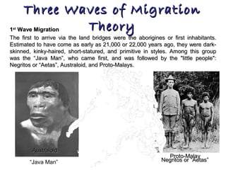 WAVE OF MIGRATION NI OTLEY BEYER Ang Wave of Migration theory ay ang teoryang tungkol sa mga sinaunang tao sa Pilipinas napinaniniwalaan ng karamihan. Ayon sa Waves of Migration Theory ni Dr. Wave of Migration theory Ang Wave of Migration theory ay ang teoryang tungkol sa mga sinaunang tao sa Pilipinas na pinaniniwalaan ng karamihan.