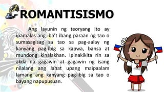 Mga Pananaw at Teorya ng. ROMANTISISMO Ang layunin ng teoryang ito ay ipamalas ang ibat ibang paraan ng tao o sumasagisag sa tao sa pag-aalay ng kanyang pag-ibig sa kapwa bansa at mundong kinalakhan. IBAT IBANG TEORYA SA PANUNURING PAMPANITIKAN.