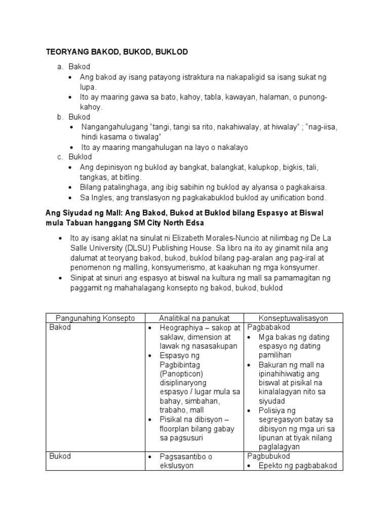 Pagsusuring Pampanitikan Sa nakaraang aralin ay natutunan mo na kung paano magsuri batay sa teoryang feminismo. Konseptong bakod bukod at buklod sa SM By The Bay Mall of Asia. Ito rin ay mas maikli kaysa sa orihinal at naglalaman ng mga kabuuang kaisipan ng pinagkunang materyal.