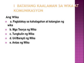 Isa sa mga pangunahing gamit o kahalagahan ng wika ang pagiging instrumento nito sa komunikasyon. Click to expand document information. Ito ay mula sa Biblia sa Genesis 11.