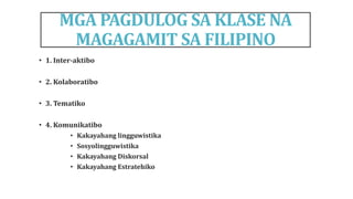 Nariyan ang sosyolohikal motibasyon pokus sa mag-aaral mga batayang teorya at simulain kung saan mas mapag-aaralan at maiintidihan kung anu nga ba ito. Ang mga Pangunahing Pagdulog sa Pagtuturo ng Filipino sa Antas ng Elemenytarya LapitPagdulo Tradisyunal Istruktural Komunikatib Whole Language g Isang Sistemang Isang pormal na sis- Isang prosesong organismo pasalita Global at nakabase TeoryaPrinsipy nasusulat tema ang wika at may sa wika language- o kumbensyun arbitraryo at pang mga. Mga TeoryaKonseptong Batayan ng Komunikatibong Pagtuturo.