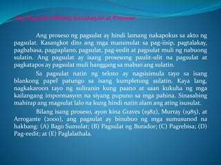 Kaugnay na Pag-aaral MGA KAUGNAY NA PAG-AARAL AT LITERATURA Ang kabanatang ito ay tumatalakay ukol sa pag-aaral at mga babasahin na may kaugnayan sa paksa ng pananaliksik na ito. MGA MAKRONG KASANAYAN PAKIKINIG PAGSASALITA PAGBASA PAGSULAT. MGA MAKRONG KASANAYAN PAKIKINIG PAGSASALITA PAGBASA PAGSULAT PANONOOD Pakikinig Kahulugan Ito ay isang aktibong proseso ng pagtanggap ng mensahe sa pamamagitan ng sensoring pandinig at pag-iisip.