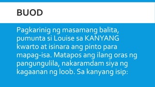 BUOD Ang kuwentong ito ay tumatalakay sa ibat-ibang damdamin na dinanas ni Ginang Louise Mallard nang malaman nyang nakasama ang kanyang asawa na si Ginoong Brently Mallard sa mga pumanaw mula sa isang aksidente sa riles. Ang pananaw na ito ay nagbibigay-halaga sa tao dahil ang tao ang sentro ng daigdig ang sukatan ng bagay at panginoon ng kanyang kapalaran.