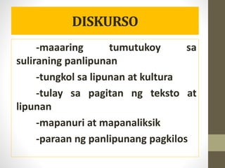 V Ang layunin ng panitikan ay ipakita na ang tao ang sentro. Ayon sa teoryang ito ay ang wika ay panlipunan at ang speech ay pang-indibidwal. YULE 1996 Binibigyang-pansin dito ang gamit ng wika sa mga kontekstong panlipunan gayundin kung paano lumilikha at nakauunawa ng kahulugan ng tao sa pamamagitan ng wika.