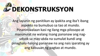 Iba't ibang teorya sa pagsusuri ng panitikan. T E O R Y A pormulasyon ng palilinawing mga simulain ng mga tiyak na kaisipan upang makalikha ng malinaw at sistematikong paraan ng paglalarawan o pagpapaliwanag ukol. O Sa pananaw na ito ay hindi lamang mahalaga ang pagbabalangkas kundi ang pagsusuri na ring ginamit. PANIMULAAng panitikan ay minang hiyas na nagsisilbing tulay na nag-uugnay sa atin sa ibat ibang kultura ng bansa sa daigdig.