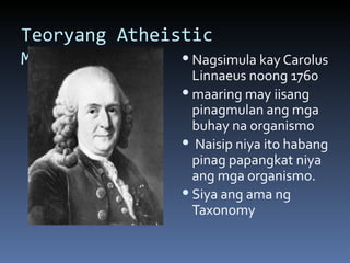Espesyal na Paglalang Genesis chapter 1 verses 1-31 Naniniwala ang nakararaming relihiyon sa daigdig na nilalang ng Diyos ang tao. Mga teorya tungkol sa pinagmulan ng tao 1. Ang pagkakaroon ng pangangailangan ay nakabatay sa matagumpay na pagtuon sa mga naunang antas ng pangangailangan.